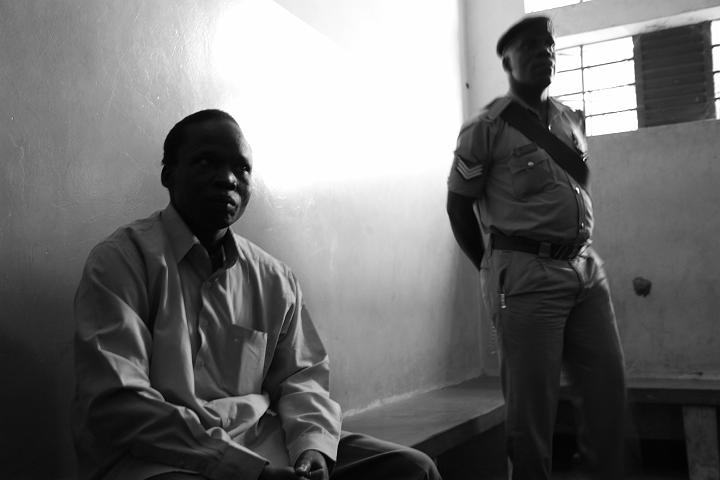 Kwoyelo speaking with one of his lawyers, Caleb Alaka, a former LRA delegate in the Juba peace negotiations (Photo: Arne Doornebal)