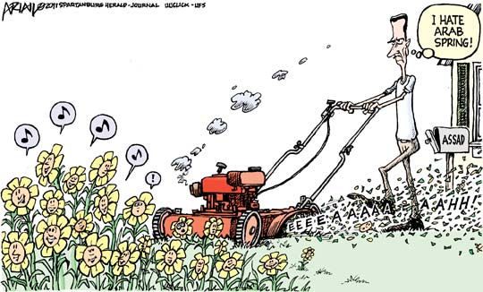 A year ago when Mr Assad famously declared that “germs” were causing trouble in Syria, echoing Colonel Muammar Qaddafi’s description, before his fall, of his opponents as “rats”, Syria’s protesters chanted, “Syrian germs salute Libyan rats!” In opposition-controlled areas taxi drivers and housewives sing songs telling Mr Assad to leave and mocking his brutal brother Maher as a donkey.