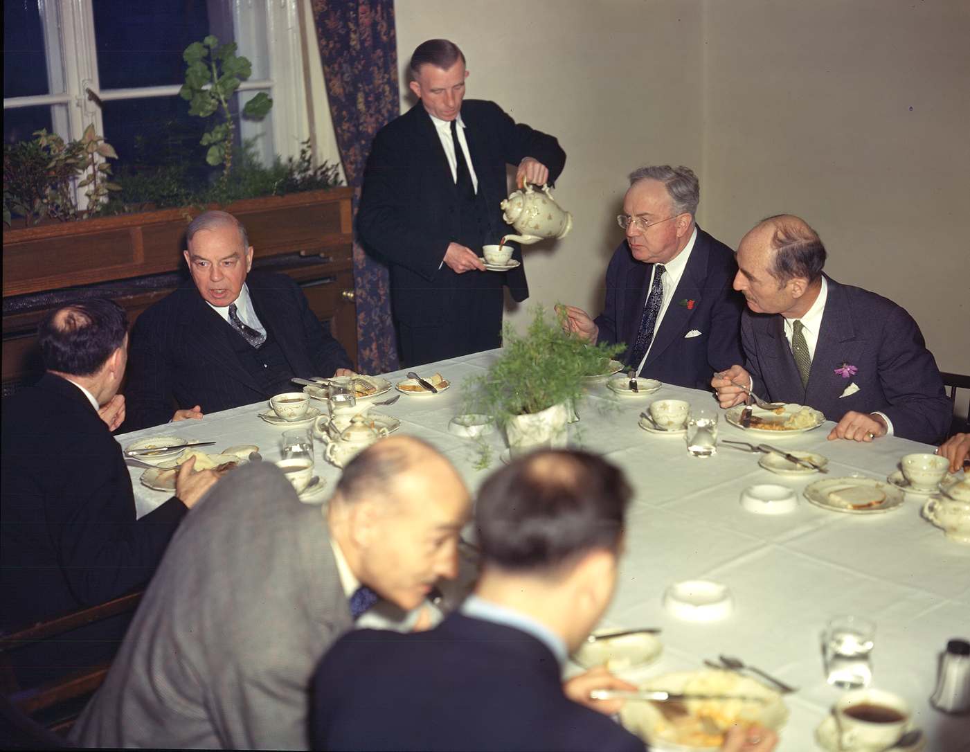 Actually the man to Mackenzie King’s right in this photograph, which is lunch at the Palace of Justice in Nuremberg on August 22, 1946, was France’s alternate judge on the International Military Tribunal, Robert Falco. He, including his bald spot, is recognizable by comparing this to many other photos of the IMT. And King dictated this as part of his diary entry of that date: “….I had lunch with the Judges as [U.S.] Judge [Francis] Biddle’s guest. I was given Biddle’s seat at the end of the table. [U.S. alternate] Judge Parker was to my left and one of the French Judges [was] to my right.”