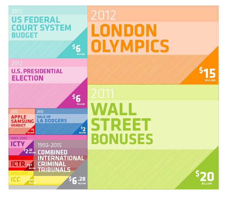Perhaps the best known example of data visualization is David McCandless’ ‘Billion Dollar-O-Gram‘ which illustrates the relative cost of everything from the war in Iraq and Afghanistan and response to the global financial crisis to the amounts spent every year on erectile dysfunction and video games. McLaughlin takes a page out of McCandless’ book in mapping out the cost of international criminal tribunals against a host of other expenditures.