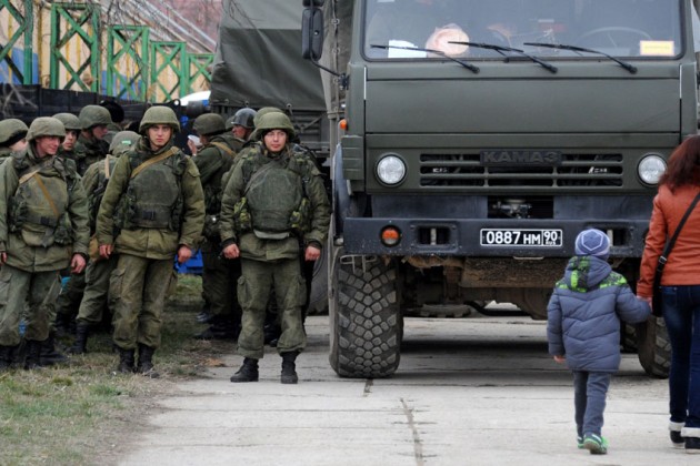 Troops stand near a Russian-made military truck in Feodosiya, Crimea (Photo: Viktor Drachev / AFP / Getty Images)