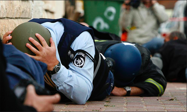 An Israeli soldier and a reporter take cover from rocket fire in Sderot in 2008 (Photo: Amir Farshad Ebrahimi / Creative Commons)