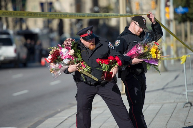 Police officers in Ottawa move flowers to the War Memorial (Photo: Justin Tang/Canadian Press)