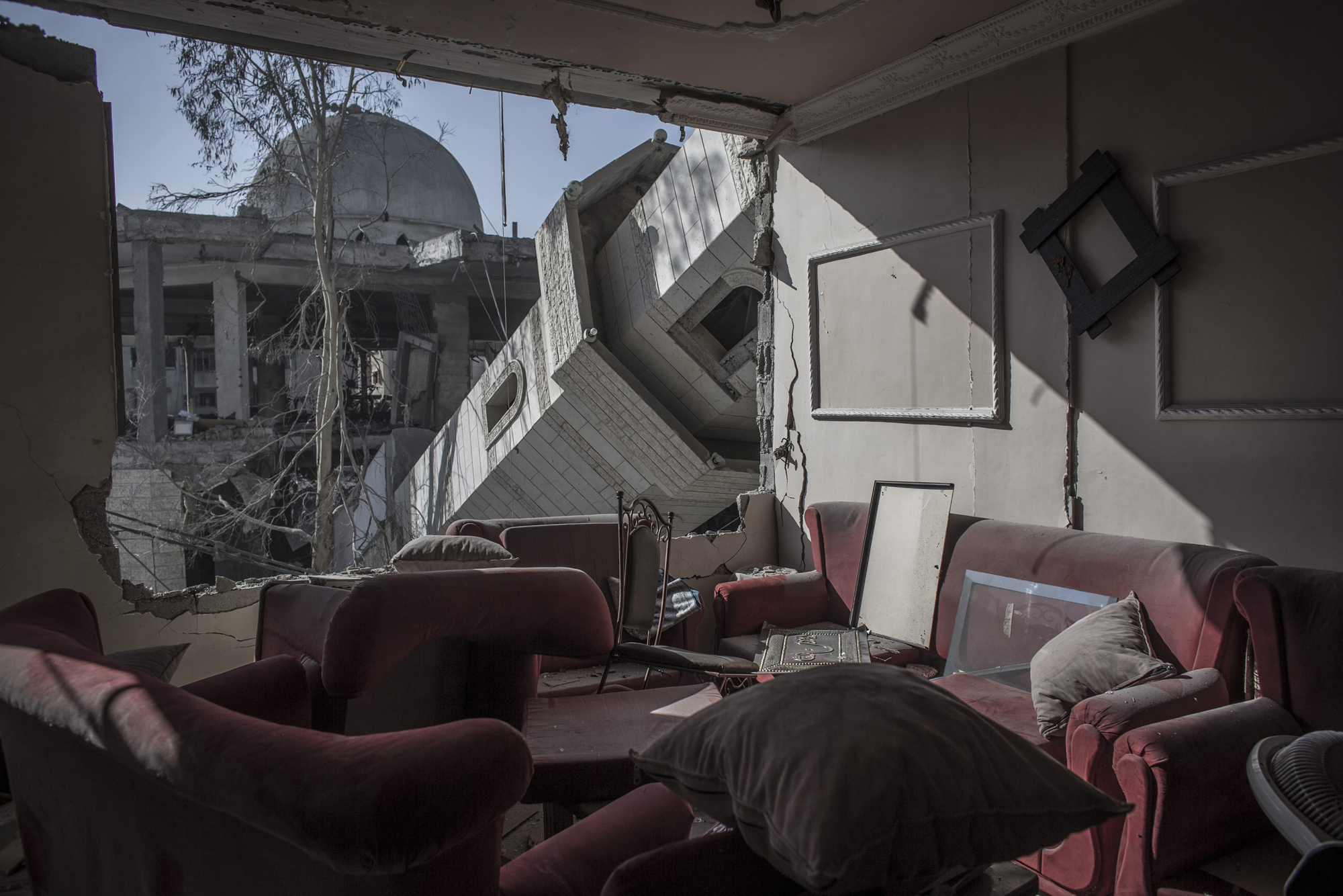 A collapsed minaret rests against the exterior of an apartment block in Gaza City (Photo: Oliver Weiken / EPA