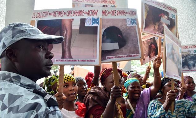 Families of victims of the 2011 violence gather outside of the courtroom where Simone Gbagbo was on trial.