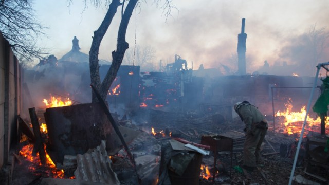 Firefighters seen here tackling a blaze following an attack on several houses Kuibishevskiy, near the airport in Donetsk, Ukraine on Nov. 20 2014. (Photo: Menahem Kahana / PRI)