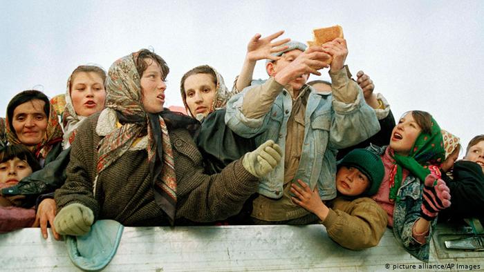 Refugees from Bosnia-Herzegovina jostle over a slide of bread during hostilities in the region (Photo: AP / DW)