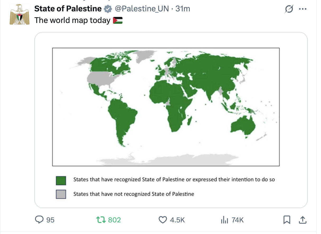 The Israeli government’s outright opposition to a prospect Palestinian state is finally obvious to Western authorities too. In announcing Canada’s recognition of Palestine, the Prime Minister’s Office accepted that “the current Israeli government is working methodically to prevent the prospect of a Palestinian state from ever being established…. It is now the avowed policy of the current Israeli government that there will be no Palestinian state.”